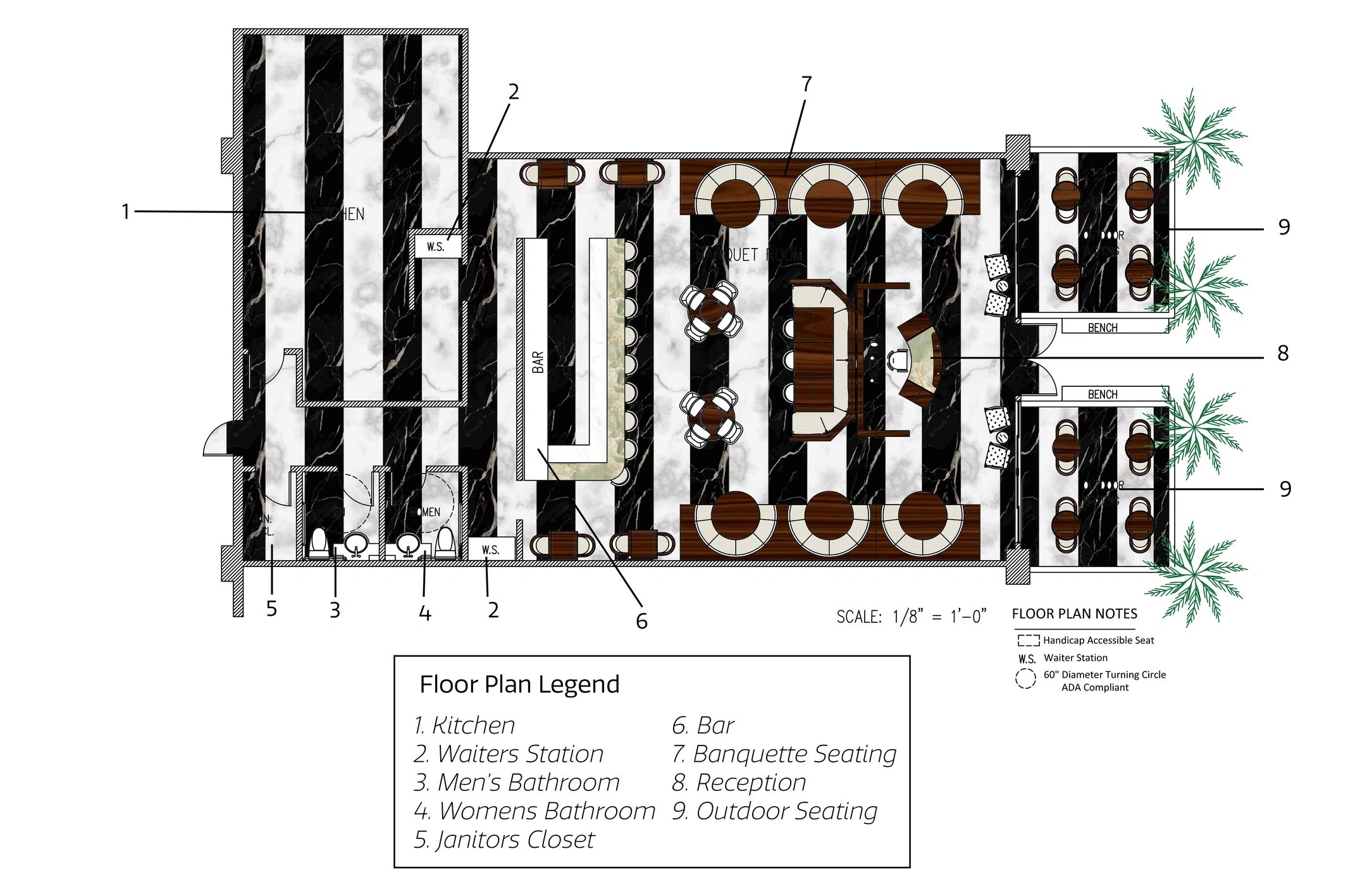 Crafting a meticulous floor plan was paramount to enhancing the dining experience, and RCP elevations were thoughtfully designed to capture every detail. Deliberate choices in color scheme and materials were made to harmonize with Miami's sophisticated lifestyle.